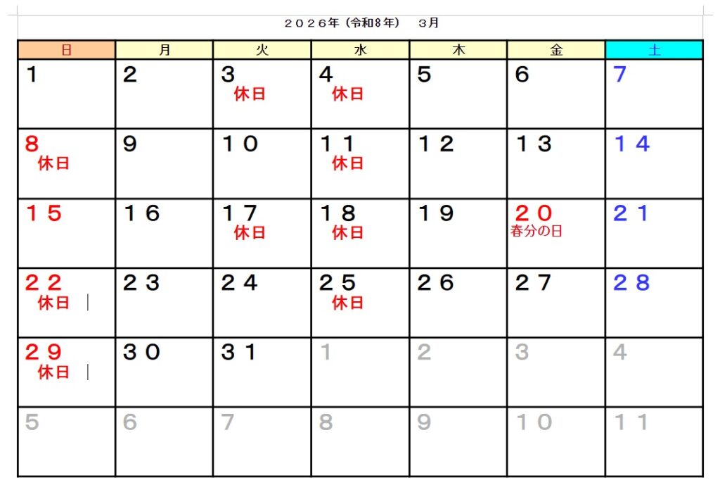 R8年3月の休日が決まりました。